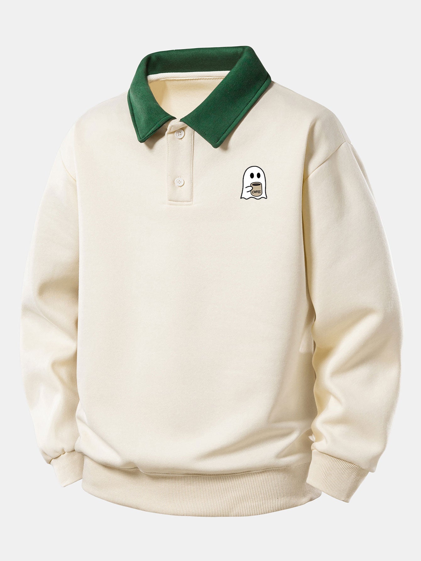 Relax Fit Ghost Drinking Coffee Print Contrast Polo Sweatshirt